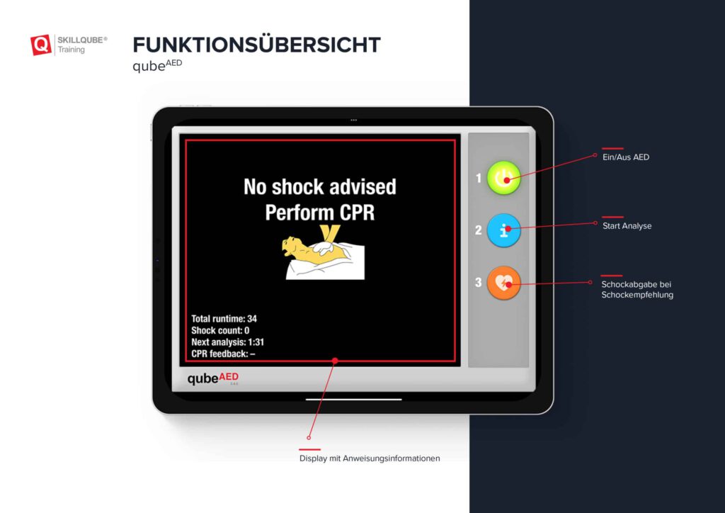Halbautomatischer Defibrillator mit graphischem Display. Unser qubeAED bietet die Möglichkeit für ein realistisches Training, nicht nur für ausgebildete Ersthelfer. Durch seine intuitive Bedienbarkeit ist er die perfekte Ergänzung in der qubeSERIE. Der qubeAED bietet voreingestellte Szenarien, was auch ein Training ohne qubeCONTROL ermöglicht und somit für jeden Ersthelfer eine realistische Simulation bietet